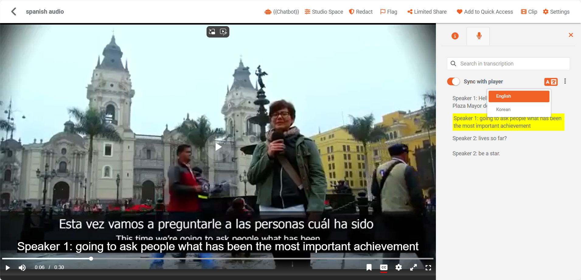 Note: Studio Space supports generating transcriptions but does not support generating translations directly. To generate translations, use automatic processing, custom upload, or the Process Modal. Once translations are processed, you can view them in Studio Space.