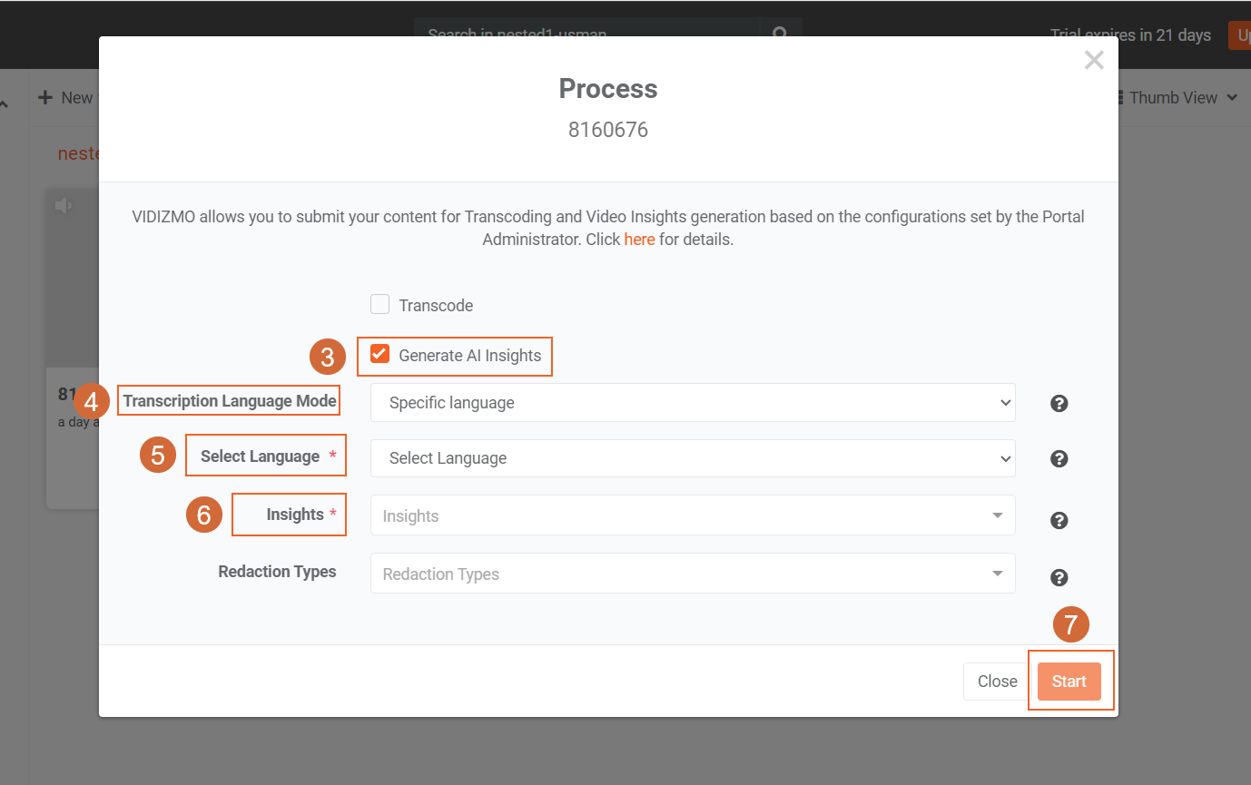 Here are the steps to begin on-demand processing for the media file on which you want to apply the Multi-Language Audio Transcription feature: