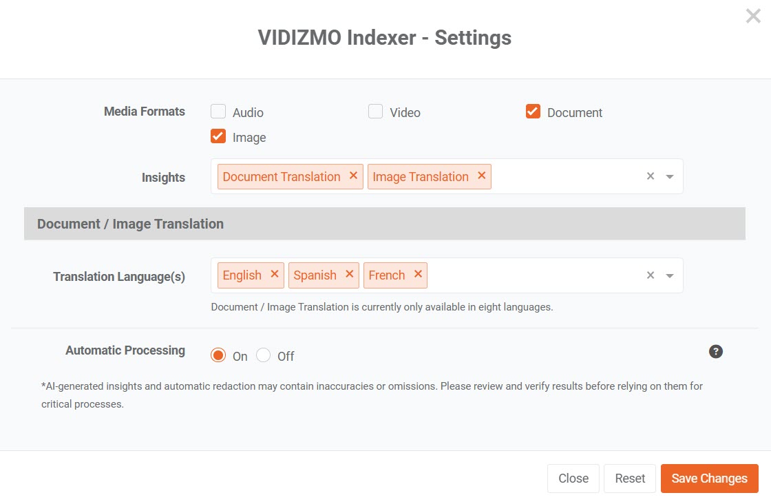 VIDIZMO Indexer supports multilingual translation for both documents and images. This allows users to automatically translate text and visual content into multiple global languages, enhancing accessibility and understanding across regions.
