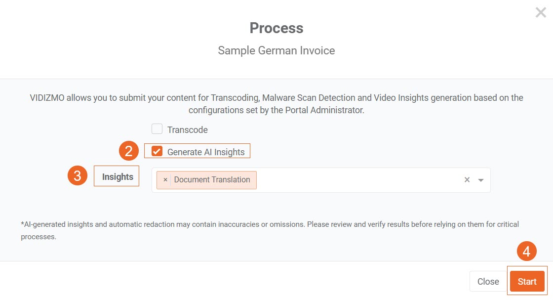 - Select Start to begin the translation process.
