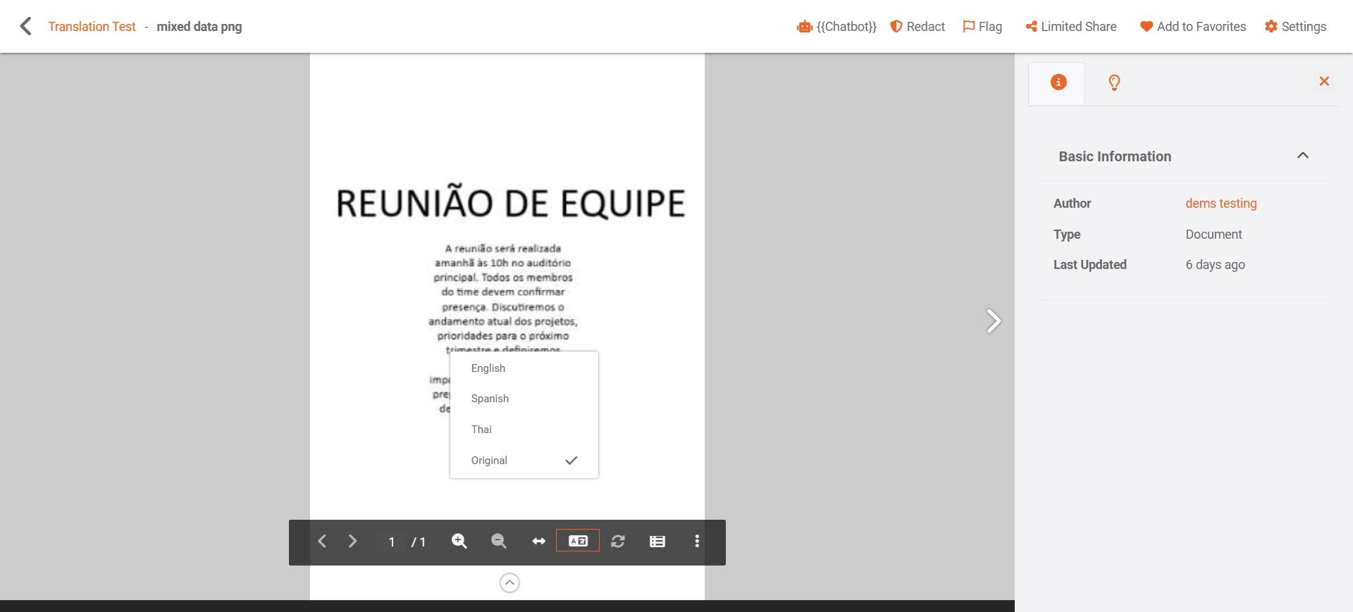Use the option to switch between available languages and view the translated versions of your document.