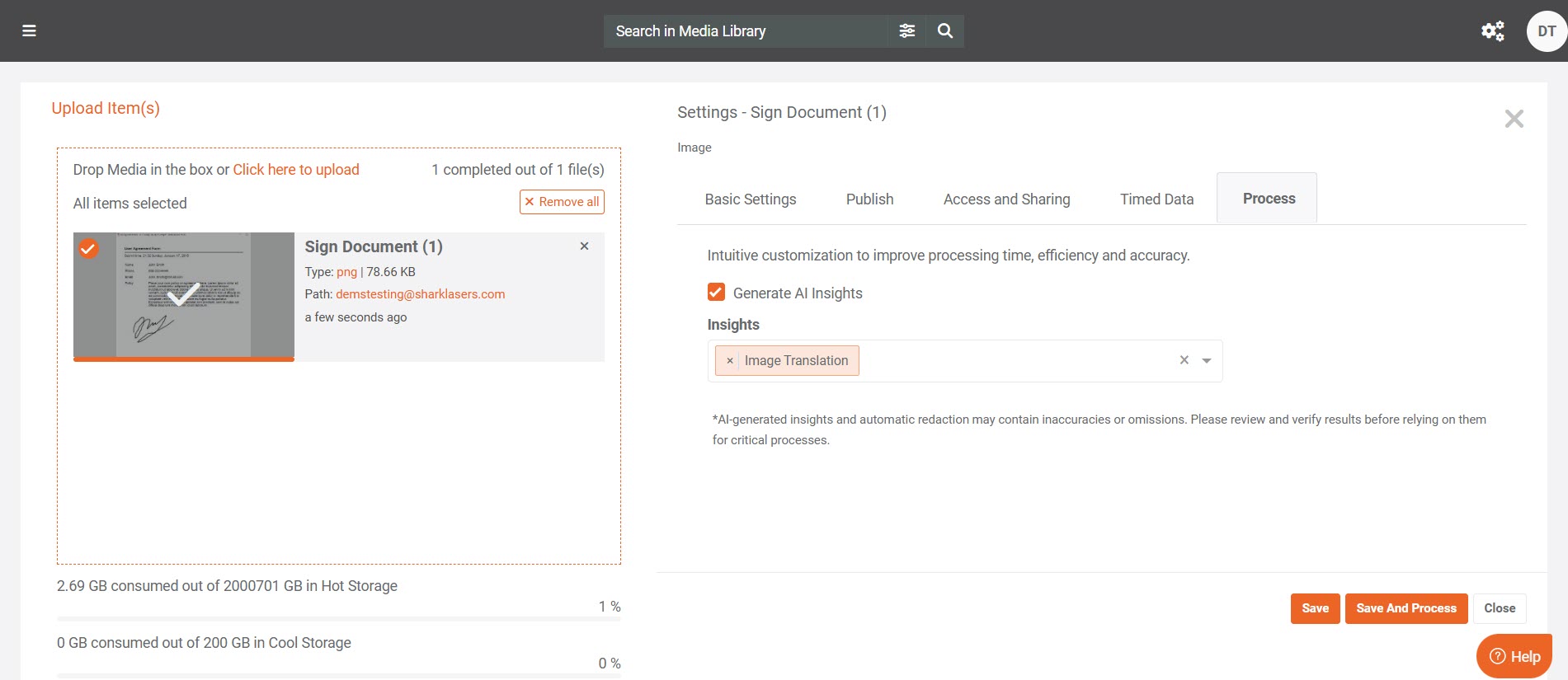 On-demand processing: Translations can be triggered manually by uploading a file and selecting Process in the modal.
