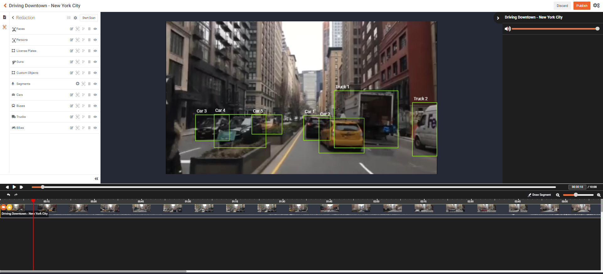To understand redaction in detail, please refer to this article: Understanding Redaction using Studio Space. In order to redact the automatically detected license plates, please refer to this article: Step by step guide to using Redaction Tool in VIDIZMO.