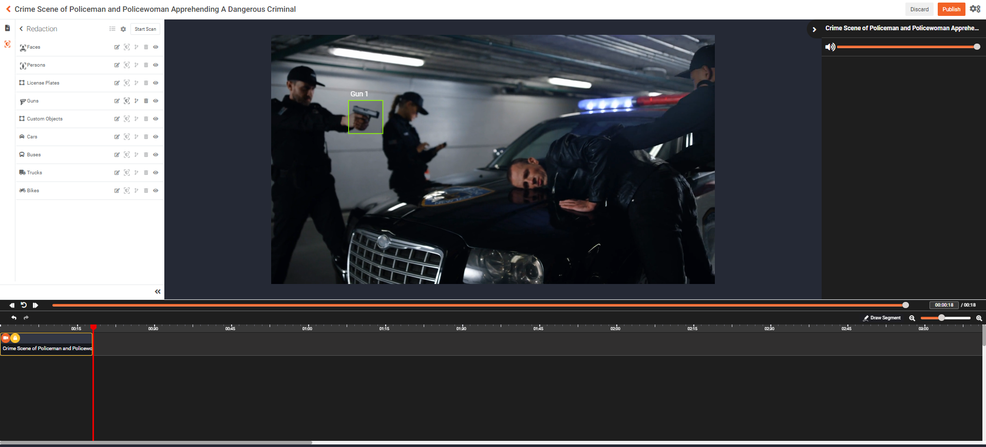 VIDIZMO indexer takes video as input. Indexer starts a workflow activity that takes some time to detect weapons in video. Video processing time may vary as it depends on factors such as video quality, duration, and resolution. Once the detection is complete, the user can see the detected weapons by navigating to Studio Space and redact all the detected weapons.