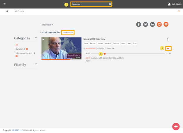 ii. The media items having the keyword (if detected from OCR) would be displayed on the library page. Click on the expand button to see the keyword occurrence(s) timeline.