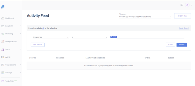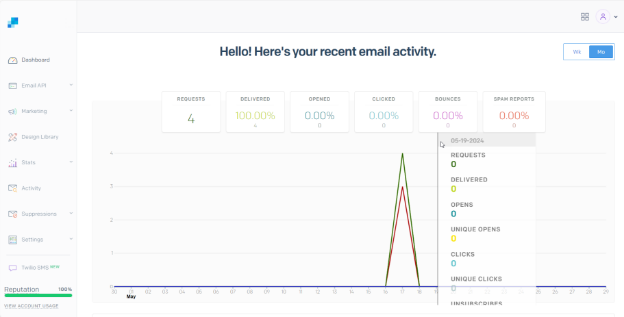 To view analytics in your SendGrid account, navigate to the left pane. Click on Dashboard to view overall analytics, or click on Activity to check the analytics of recent email activity.