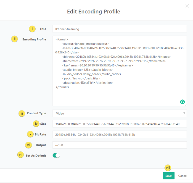 vii. You can modify the option Set to Default to set/unset this Encoding Profile as default, for handling the most common use-cases.