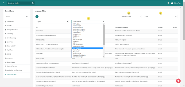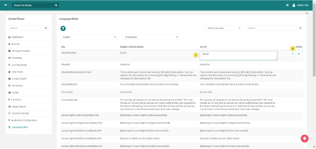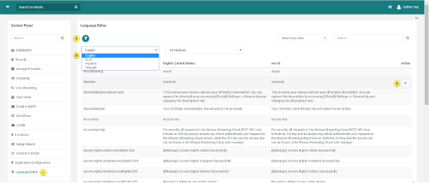 VIDIZMO allows users to centrally edit resource keys i.e. confirmation messages, alert notifications and other user prompts in all available languages within the application using Language Editor. This helps customer organizations incorporate their jargon and terminologies in the application language allowing end-users to familiarize with the system more conveniently.
