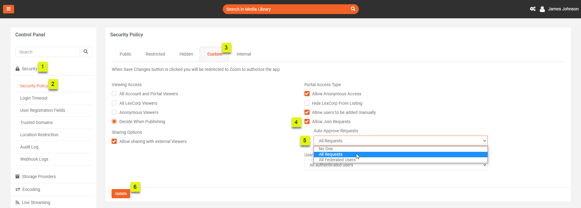 6. Click on the Update button and your settings will be saved to auto-approve all requests from users to join the Portal.