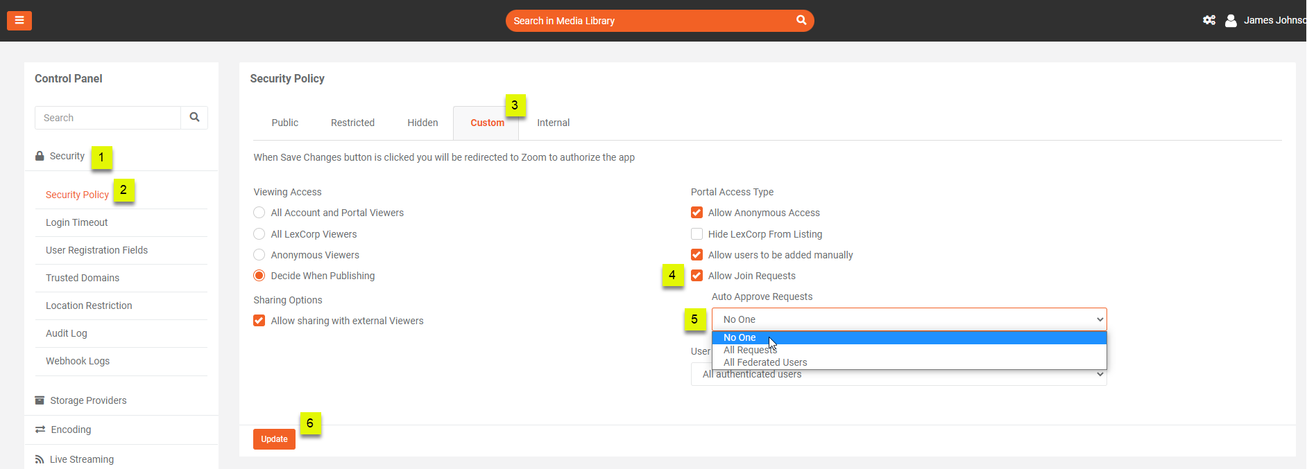 Note: By default, Internal, Restricted and Hidden Security Policy Types allow Join Requests to be moderated for approval, and can be used without any further configuration. Below are the steps to configure it via Custom Security Policy.