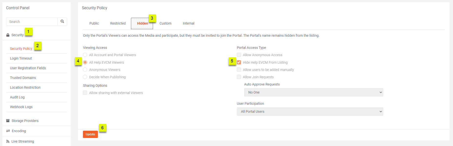 Selecting Hidden as Security Policy Type. In the Hidden Security Policy type, all media uploaded in the Portal is accessible to Portal users only. This Portal is not anonymously accessible, and users cannot be added manually to this Portal. Furthermore, Join Request option is disabled by default.