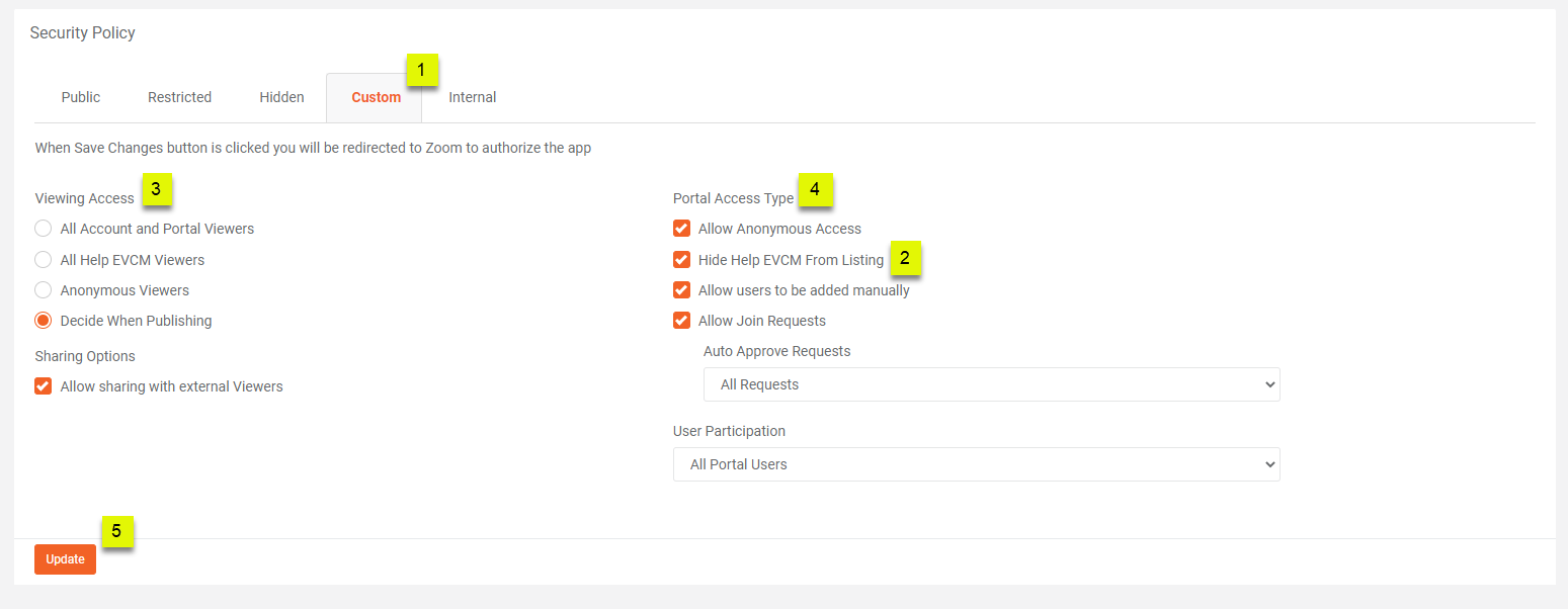 Selecting Custom as Security Policy Type. In the Custom Security Policy type, Viewing Access as well as Portal Access Type are all available for customization as per business requirements.