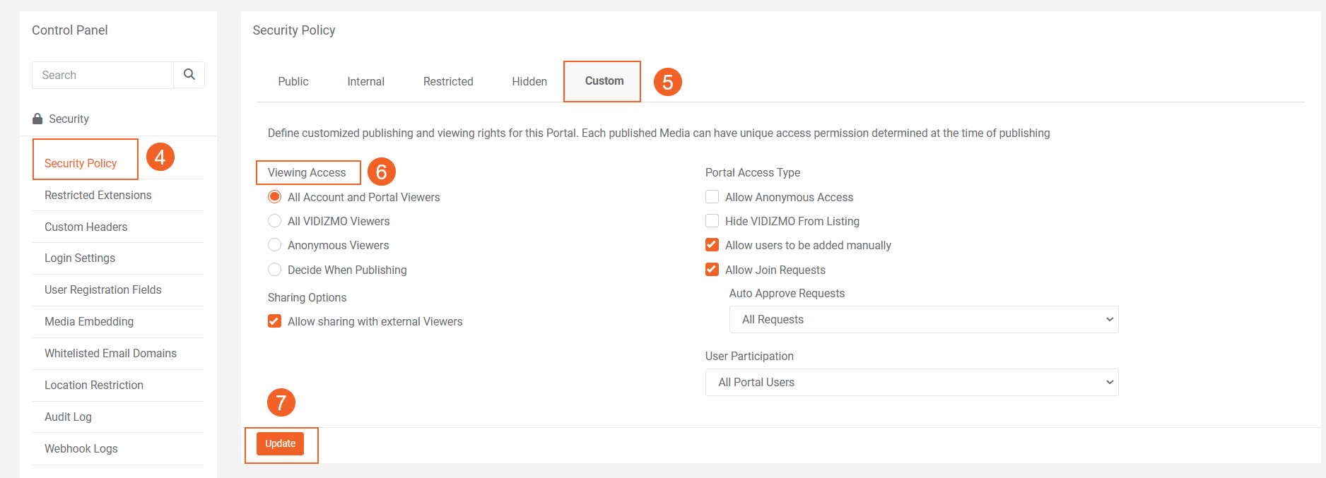 To learn about Portal's Security Policies and Viewing Access, see: Understanding Portal's Security Policies