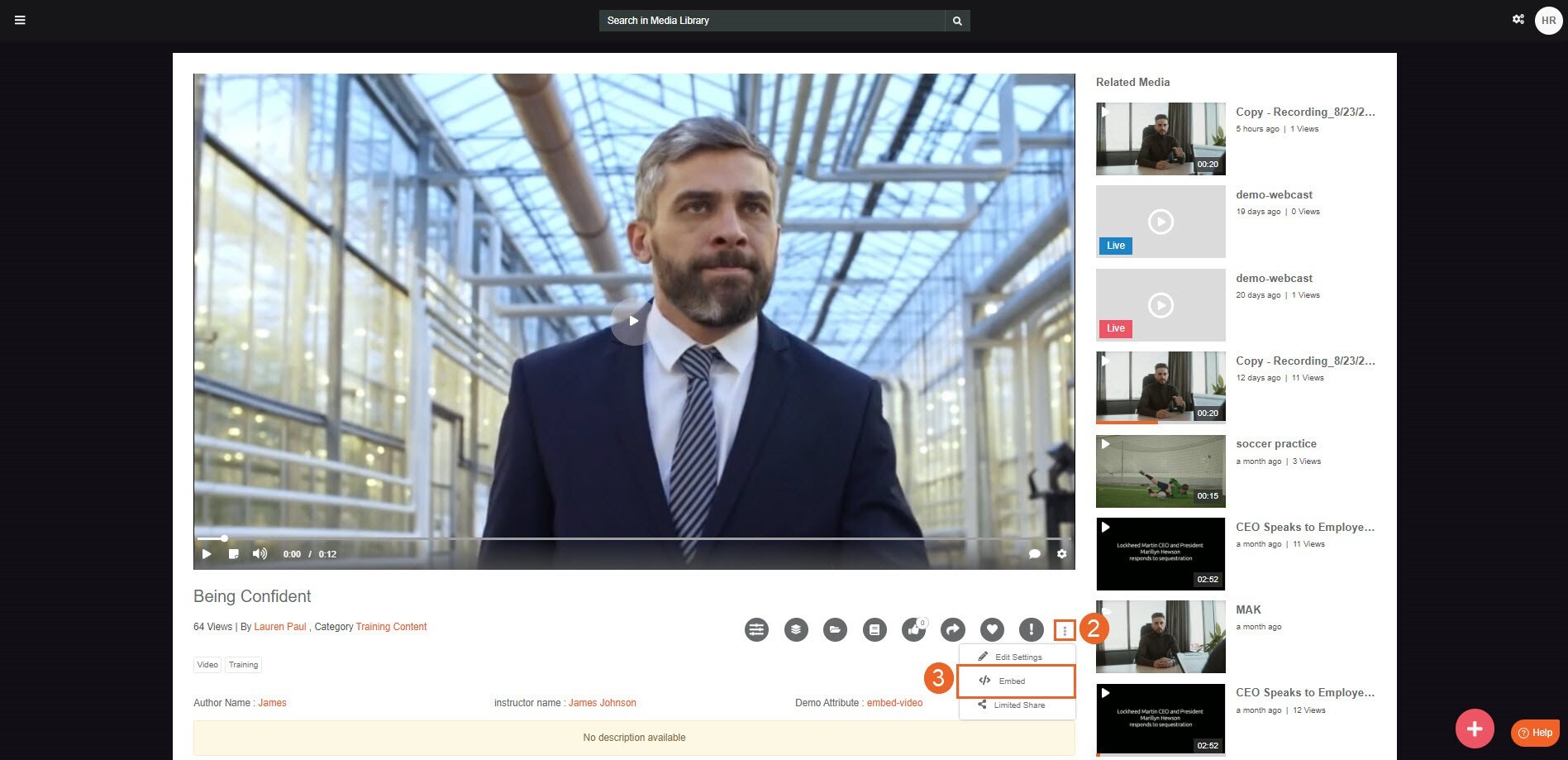 9. Access the overflow menu of your selected media and choose "Embed."The default setting for Manager+ users has this option enabled.