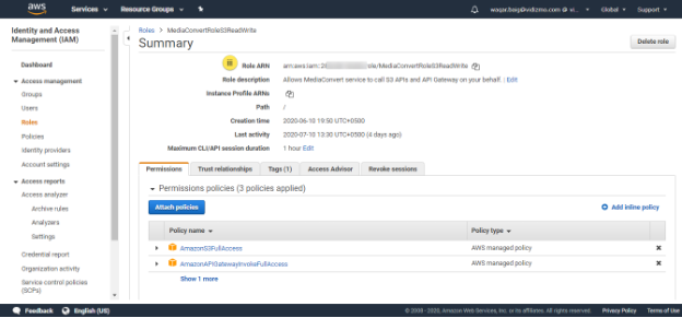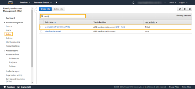 ii. Navigate to Roles and search for MediaConvertRoleS3ReadWrite and click to open it.
