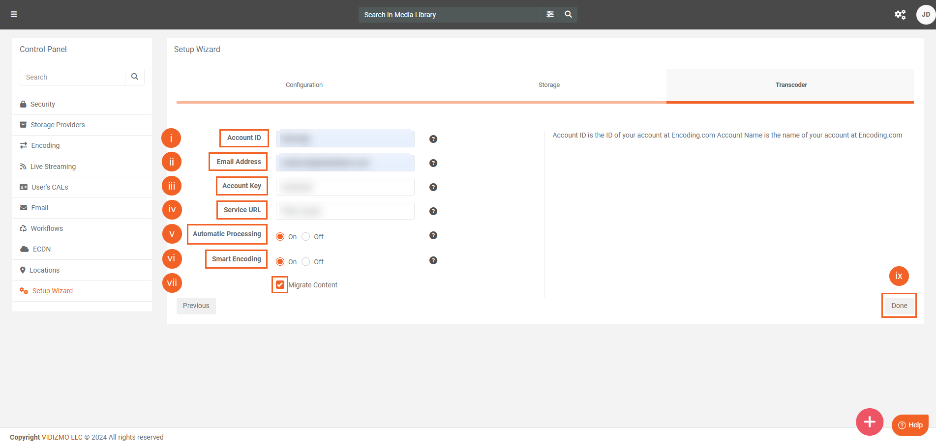 iii. Enter the Account Key generated by your account on the Cloud Encoder service.