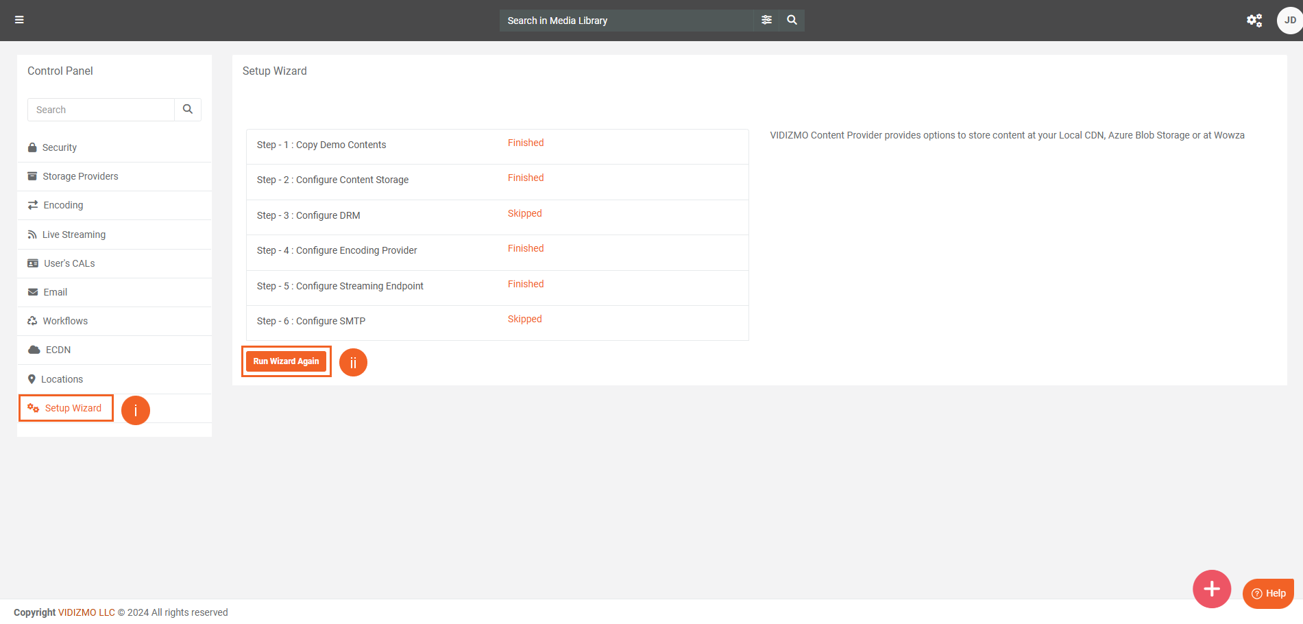 Setup Wizard allows you to initially set up your Portal's Storage Provider and Transcoder for a seamless user experience through out the application usage. It takes you through a series of easily configurable steps to help set up the system.