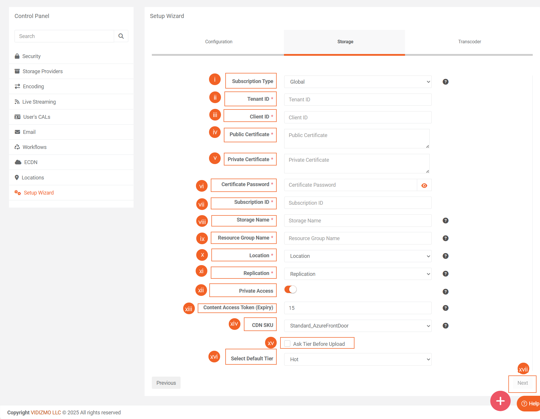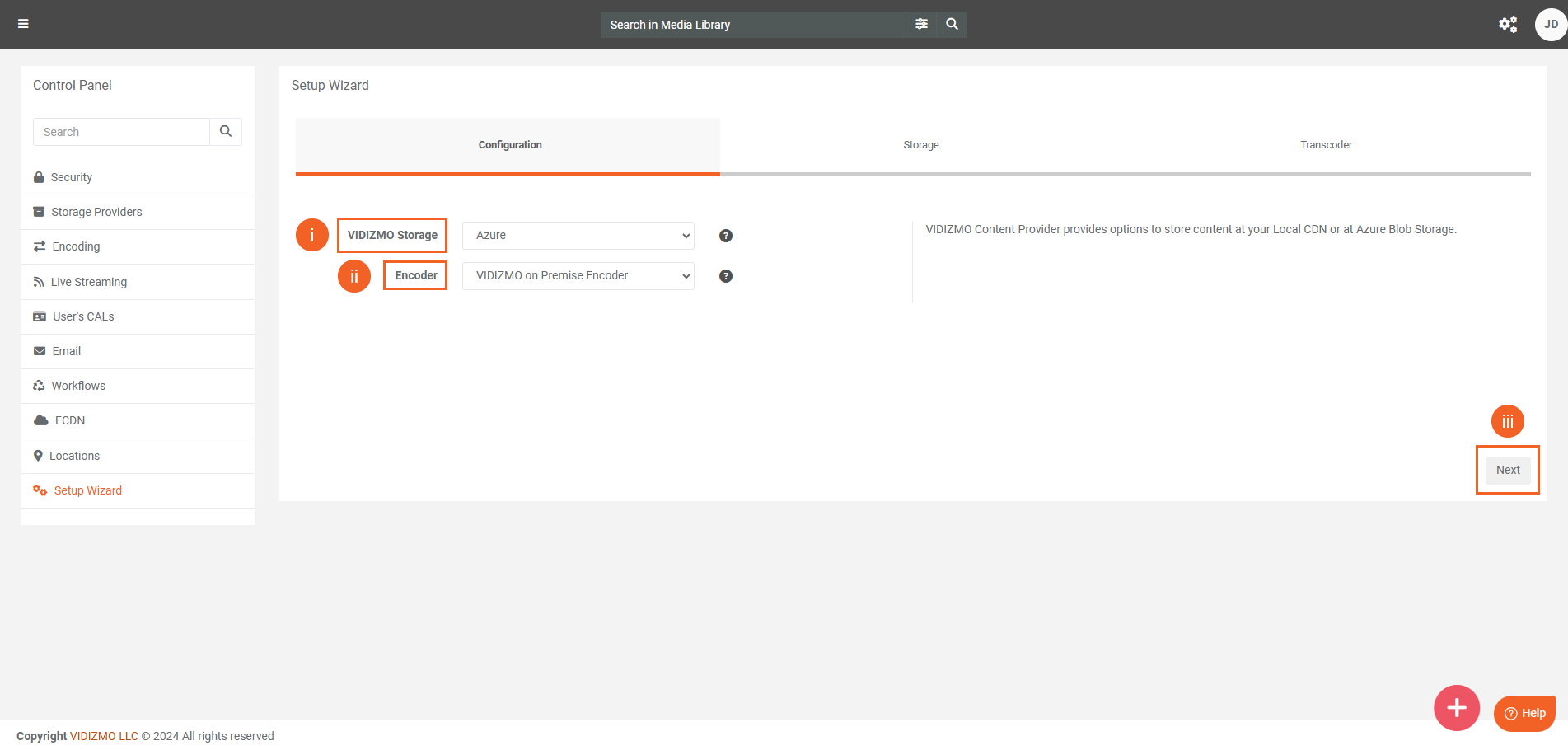 Note: VIDIZMO provides a set of default configuration for your Storage and Transcoding Provider which can be overridden via Setup Wizard due to evolving business requirements. Furthermore, apart from the possible configurations, VIDIZMO also offers the flexibility of choosing any other Storage Providers or Transcoders that the organization may want to configure their application with.