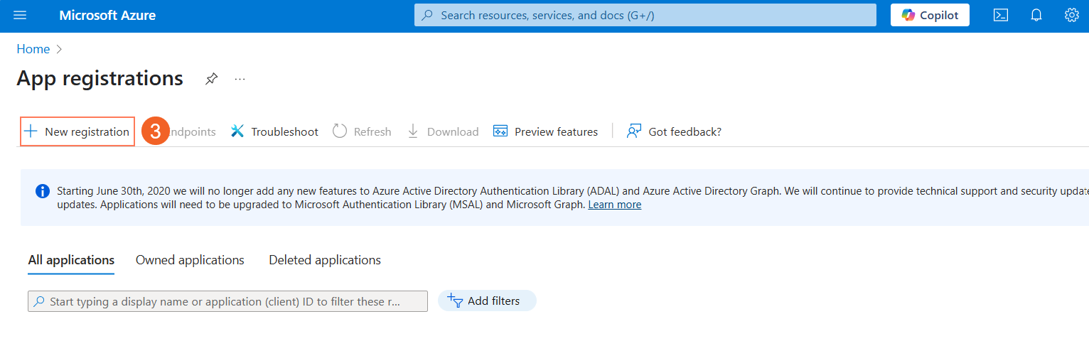 - In the App registration section, click on the "New registration" tab to begin the process of creating a new application.