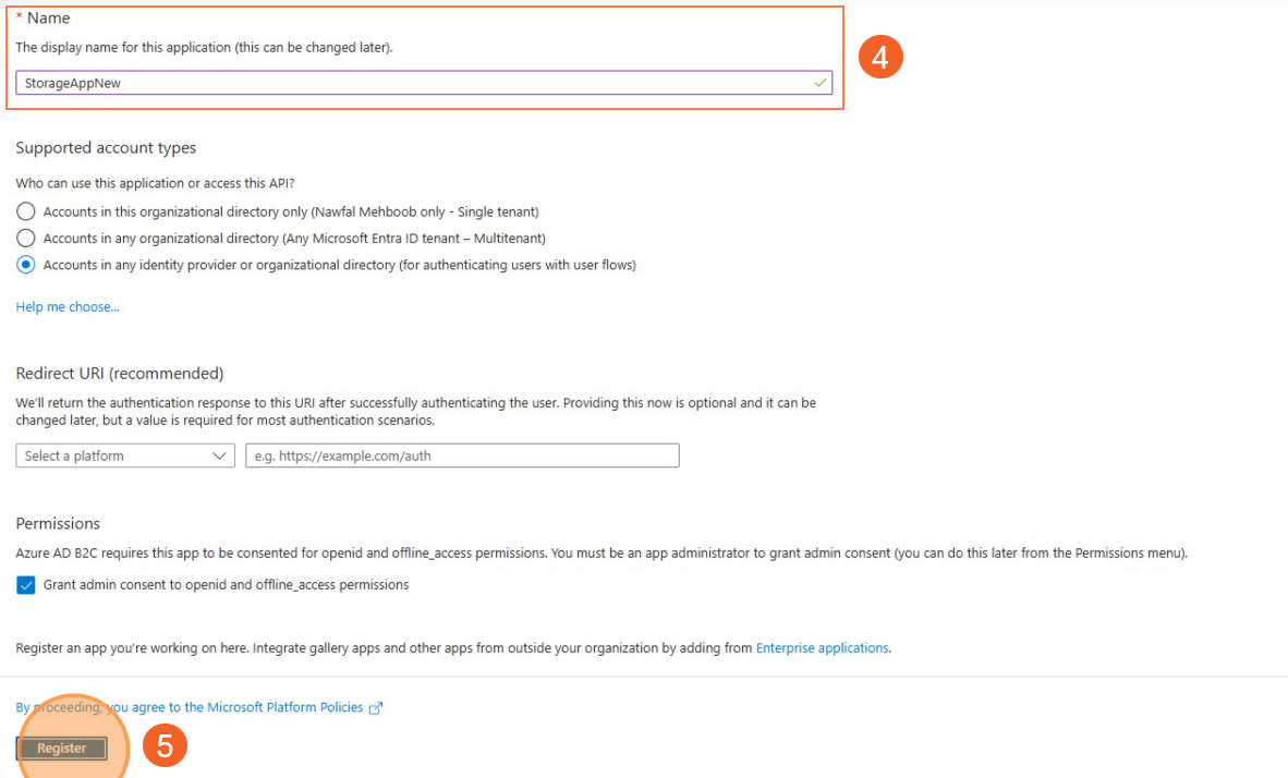 4. In the form that appears, provide a Display Name for your application. For example, you can enter: StorageAppNew. 5. After entering the display name and any other required details, click on the "Register" button to create your new storage application in the Azure portal.