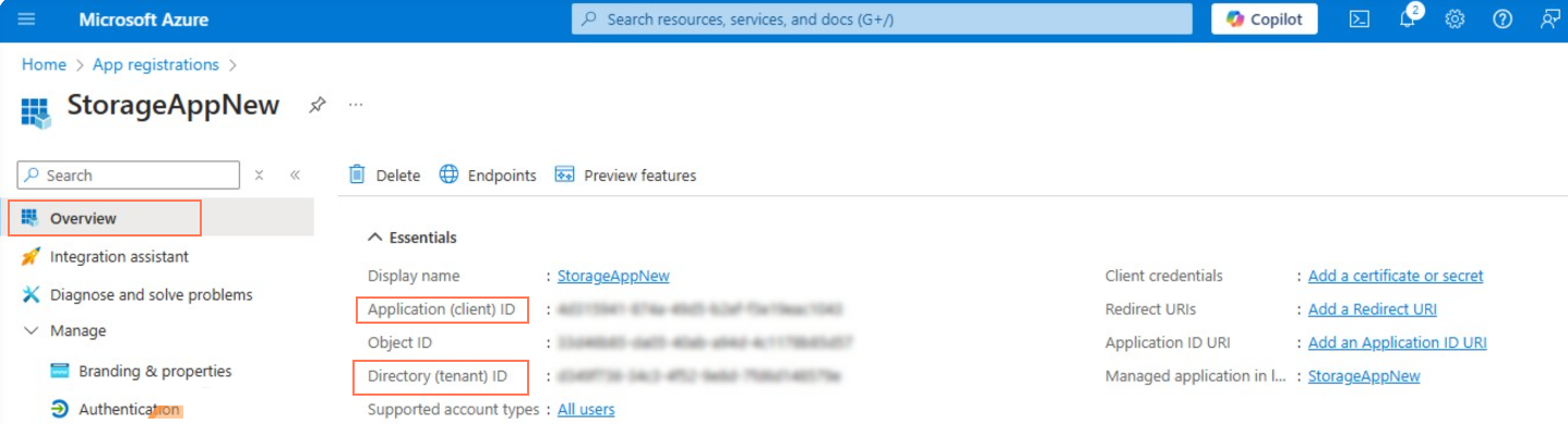 After registering your application, navigate to the Overview tab to retrieve the Application (client) ID and Directory (tenant) ID. Copy and securely store these values—they will be required later when configuring storage via the Setup Wizard.