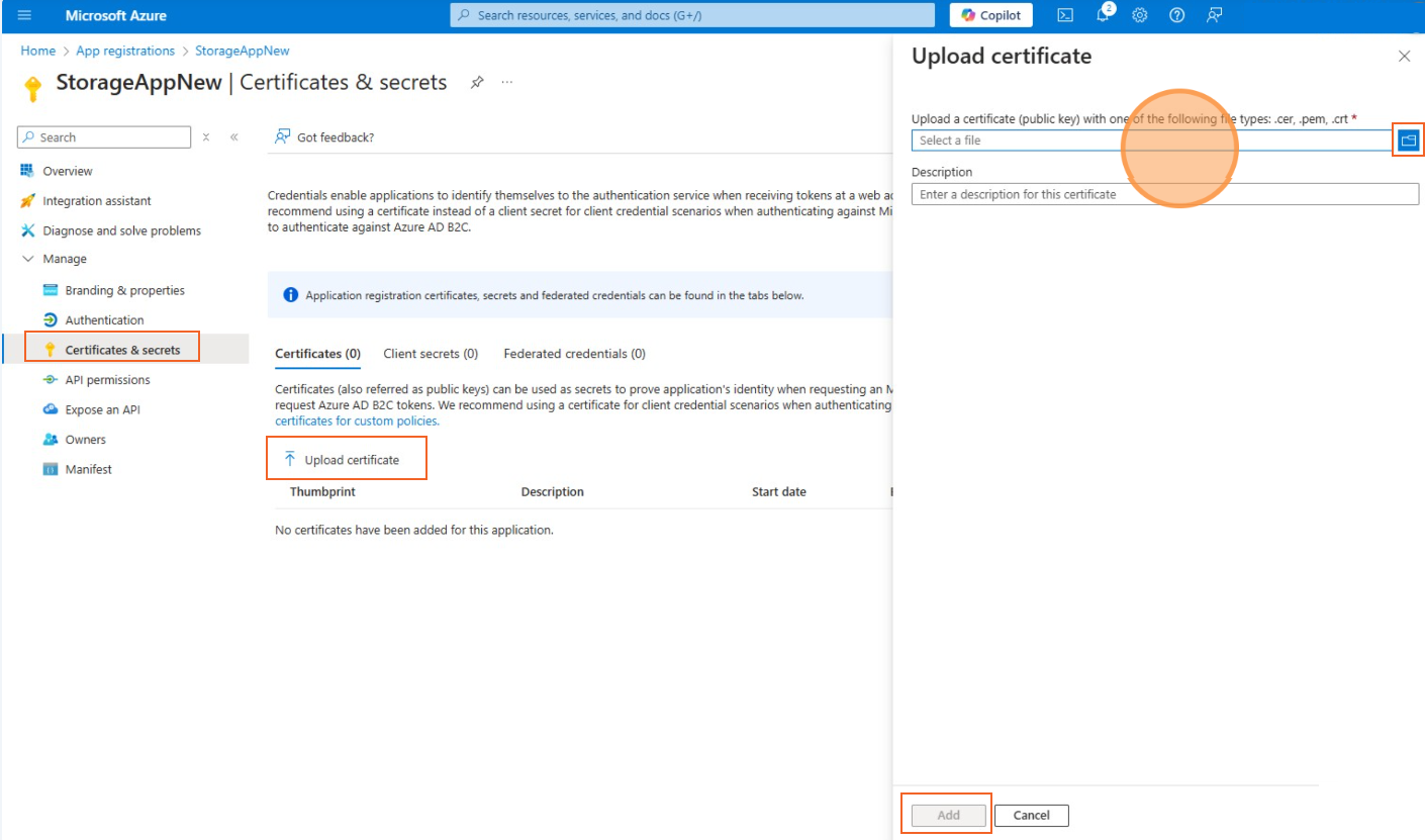 Click on Certificates & secrets, then switch to the Certificates tab.