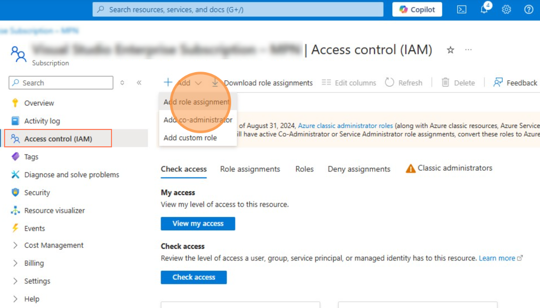 - Click Add and select Add role assignment.