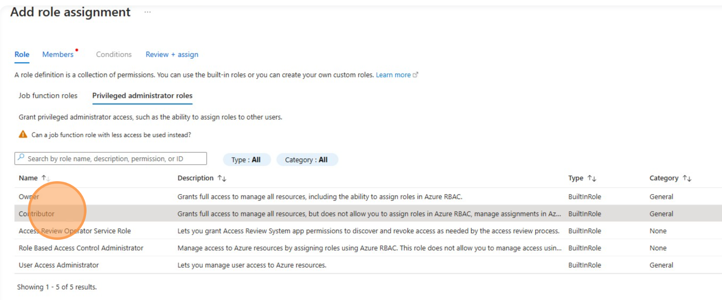 - In the role assignment pane, switch to the Privileged administrator roles tab and select Contributor.