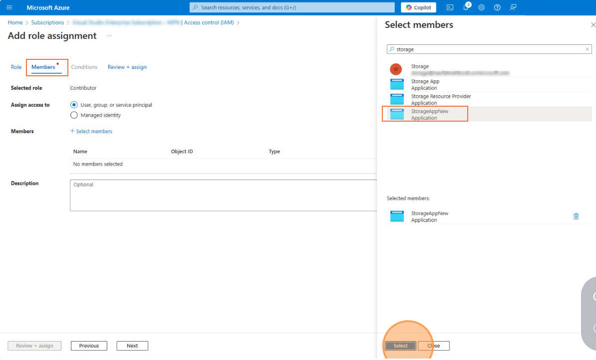 - Go to the Members tab and click Select members. In the search box, type the name of the storage application you created, then choose the application from the drop-down list.