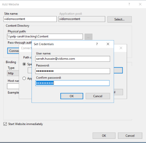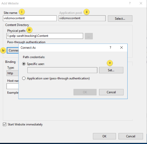 1. Now, on the Add Website screen, make sure you map the newly created web site onto the content storage folder by setting up your site's binding information as following: