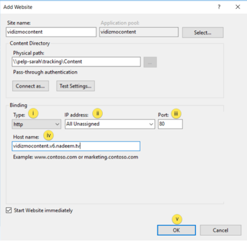 ix. Enter the Host Name, to specify the DNS against which to resolve your IP Address. Select Ok to create website with configured settings. Copy and save the Host Name you enter here, to be used later in Setup Wizard Configuration.