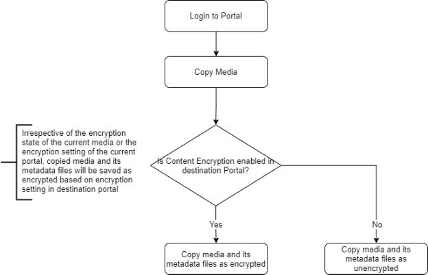 When you copy media from one portal to the other, irrespective of the current encryption state of the media - the encryption setting in the destination portal determines whether the copied media will be saved as encrypted or unencrypted. Here, destination portal refers to the portal in which the media is being copied to.