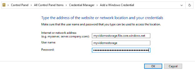 4. Type in the FQDN of your Azure file share storage account. The username should be your storage account name and password should be the access key for the storage account. See screenshot below: