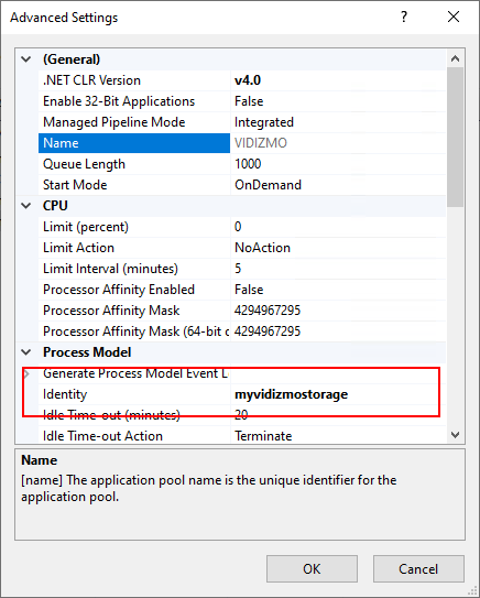 3. Under Process Model, change the Identity to use the new user account we created in previous steps. See below screenshot: