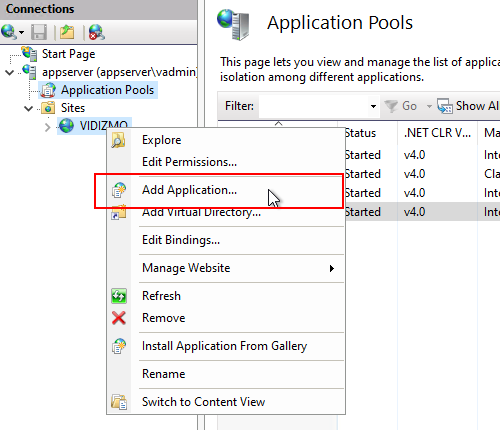 4. In IIS Manager, expand Sites > right click your VIDIZMO website > select Add Application. See screenshot below: