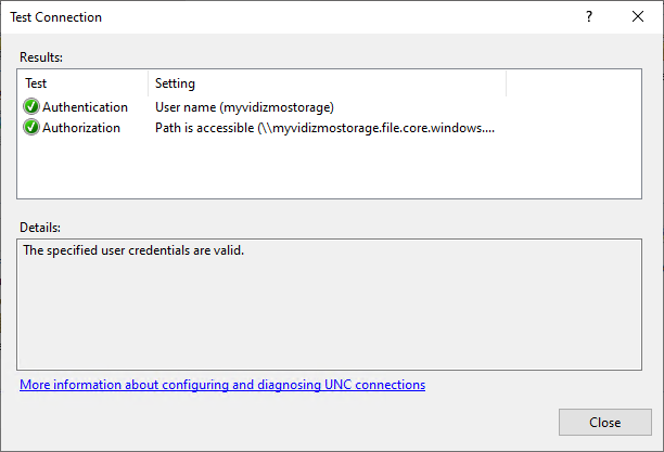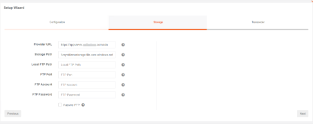 4. Under Storage, enter the Provider URL as 'https://'. E.g. "https://appserver.testserver.com/cdn". For Storage Path, type the UNC path of your Azure file share e.g. \\myvidizmostorage.file.core.windows.net\\myvidizmofileshare. See below screenshot: