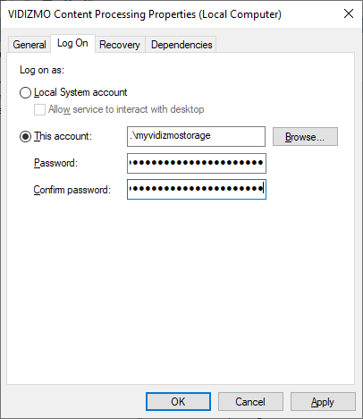 4. Under "Log on as", select "This account" radio button and select the user account you created in previous steps. See below screenshot: