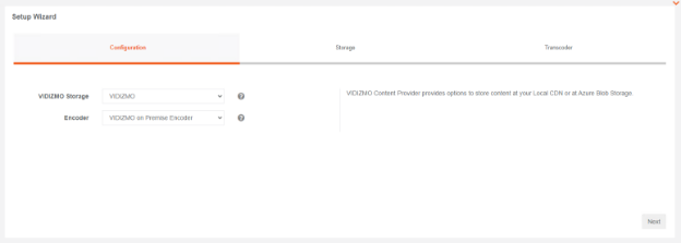 3. Under Configuration, select VIDIZMO Storage as "VIDIZMO" and Encoder as "VIDIZMO on Premise Encoder" and click Next. See below screenshot:
