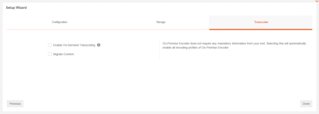 6. Under Transcoder, leave all check boxes unchecked and click Done to confirm changes and start the setup wizard process which would configure your new storage based on Azure file share. See below screenshot: