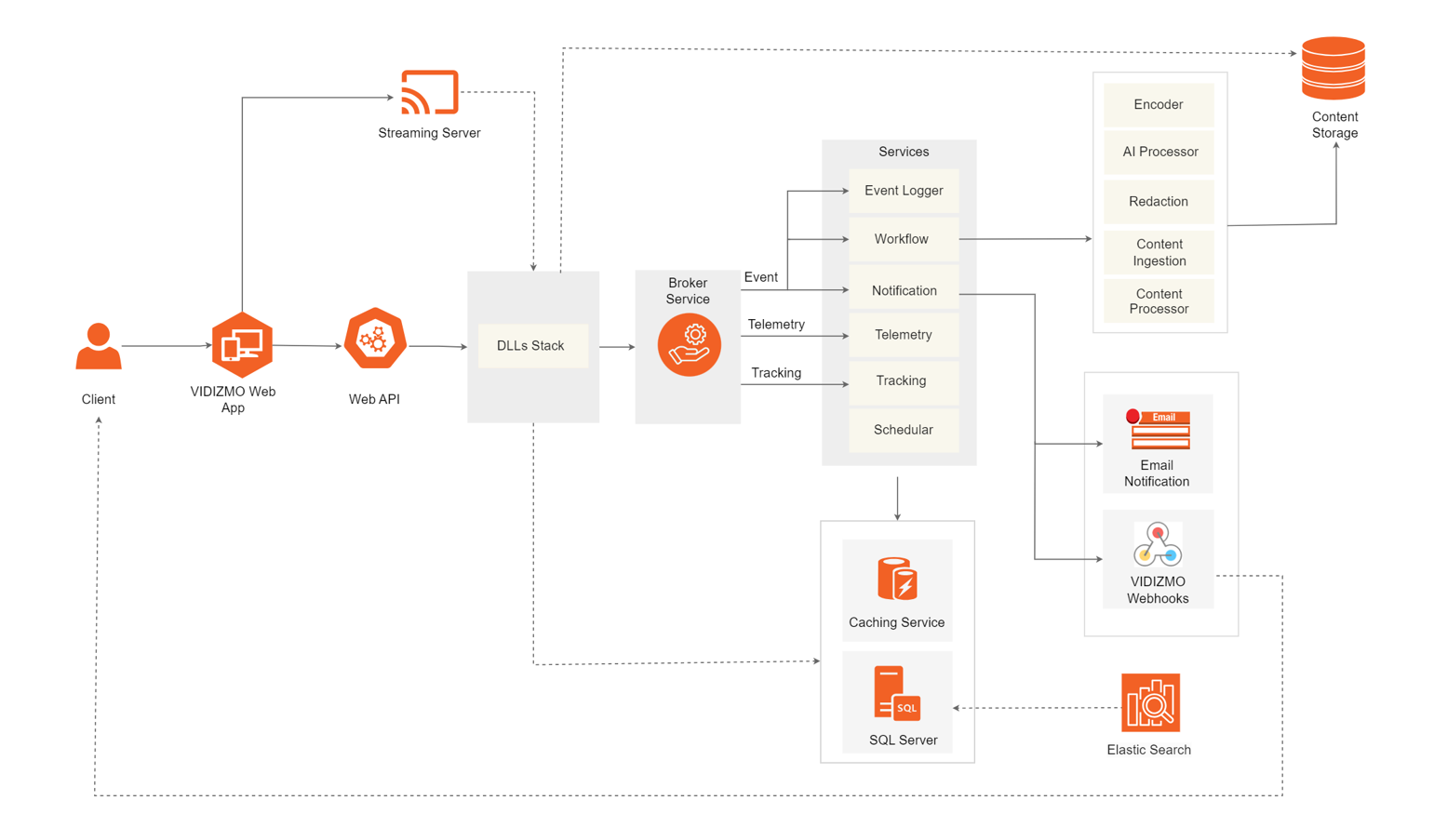 Prior to deploying and configuring VIDIZMO, understanding its high-level system and component design is crucial. This section provides essential details about the VIDIZMO software and its components, which are required for VIDIZMO to operate.