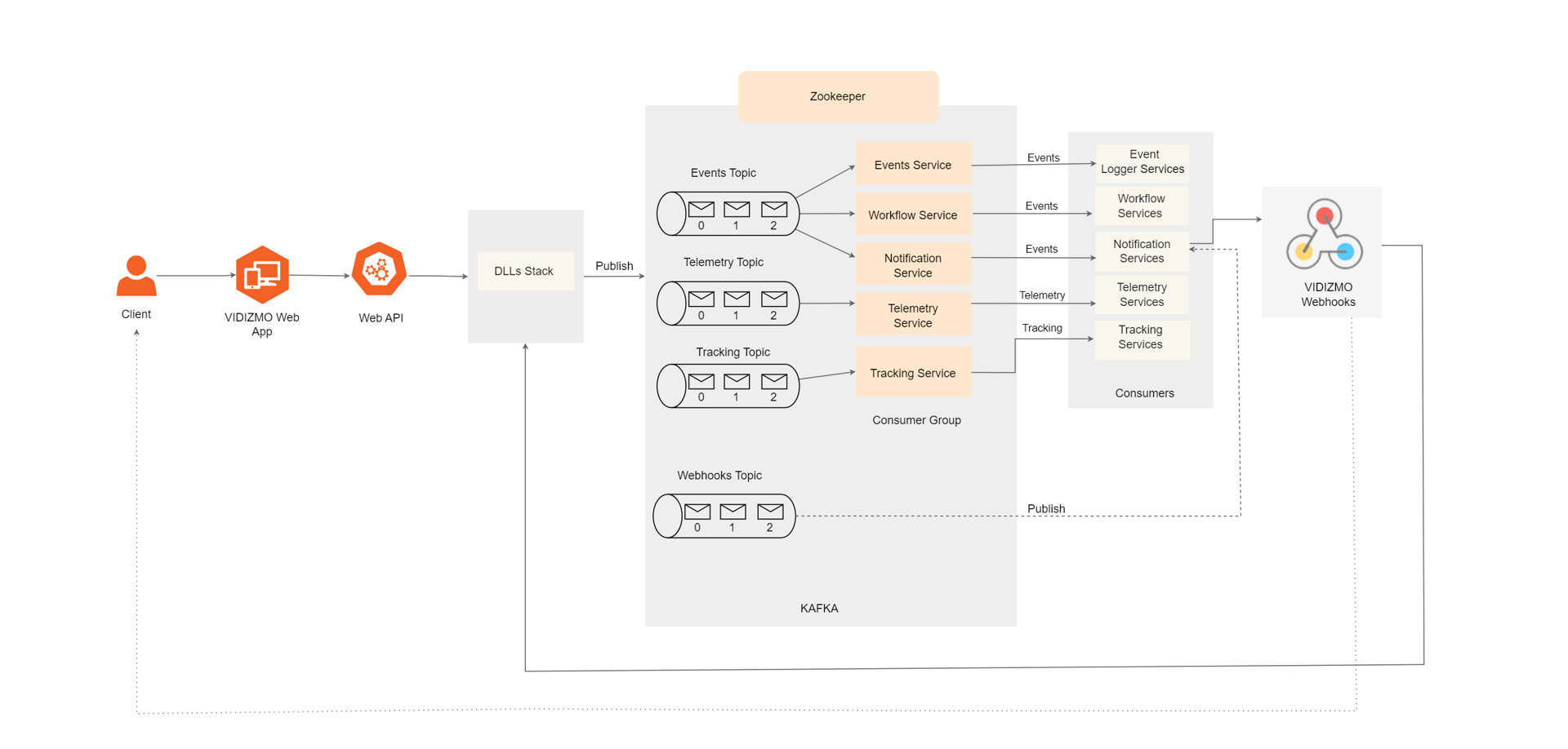 VIDIZMO, with its complex event processing needs, finds value in the seamless integration and communication offered by Event-Driven Architecture (EDA). The incorporation of Apache Kafka, a distributed event streaming platform, enhances data processing and communication within VIDIZMO's ecosystem. By utilizing Kafka as a broker service, VIDIZMO establishes itself as a central component for inter-communication among its various services. This approach supports real-time data streaming event-driven architecture and ensures reliable communication between different system components.