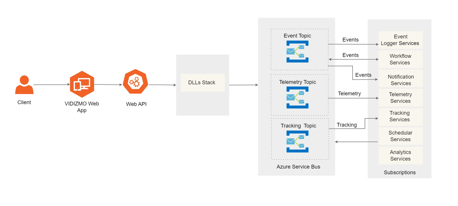 When a new video is uploaded or requires processing, such as transcoding, an event is triggered and sent to an ASB topic. Each topic, resembling a virtual queue, receives a copy of these messages independently. In this context, subscriptions establish links between services and events. This enables services like Event Logger, Workflow, Notification, Telemetry, Tracking, Analytics, and Scheduler within VIDIZMO to subscribe to relevant topics via subscriptions, ensuring they only receive messages pertinent to their interests. Subscribed services are the recipients of event messages from these topics and process the events in accordance with the designated functionality. Overall, this architecture fosters modular and scalable communication between services within the VIDIZMO platform.