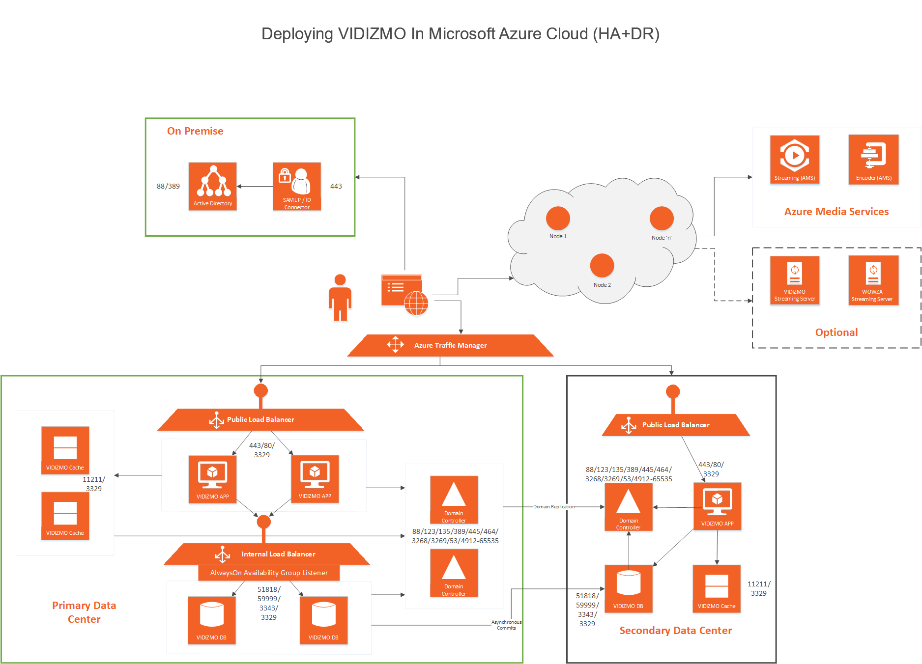 This architecture illustrates how VIDIZMO can be set up as a High Availability (HA) and Disaster Recovery (DR) solution using Microsoft Azure Cloud.