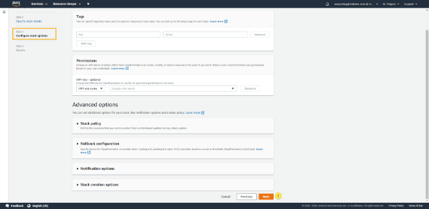 8. In this step, provide Tags, Permissions, set Stack policy, etc. In this article, we have used the default settings. Therefore, we did not make changes in any field. You can learn more about Setting AWS CloudFormation Stack Options here, and can make changes as per your needs.