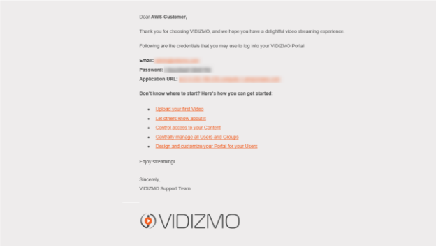 If you have entered your e-mail address in step 7, you will receive an e-mail having your VIDIZMO portal link, Admin Id and Password and a few helpdesk articles to getting started to your VIDIZMO app.
