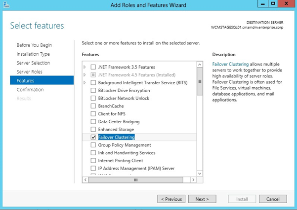 Click Next until you reach the Select Features dialog box. Select the Failover Clustering checkbox. When prompted with the Add features that are required for Failover Clustering dialog box, click Add Features. Click Next.
