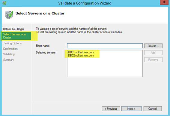 4. In the Select Servers or a Cluster dialog box, add the server hostnames of the SQL Server instances that you want to configure as replicas in your Availability Group. Click Next.