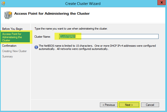 9. In the Confirmation dialog box, click Next. This will create the Windows Failover Cluster using the servers as nodes of the cluster, add DNS and Active Directory entries for the Cluster Host Name.