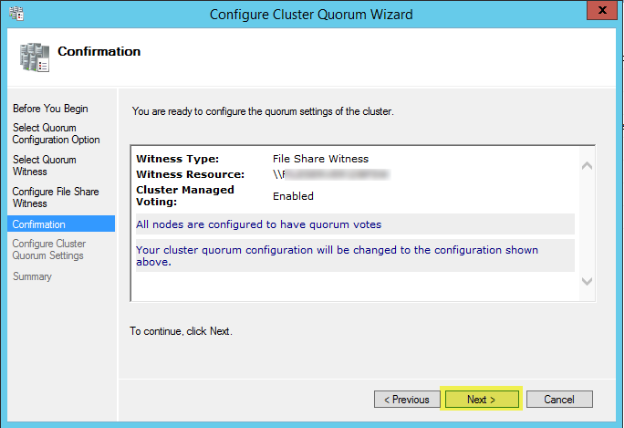 We will be configuring a file share witness for our cluster quorum setting. By default, the wizard will configure the cluster to use Node Majority.