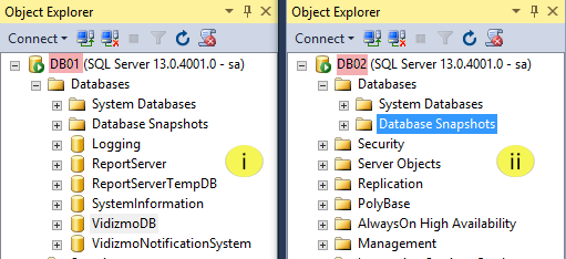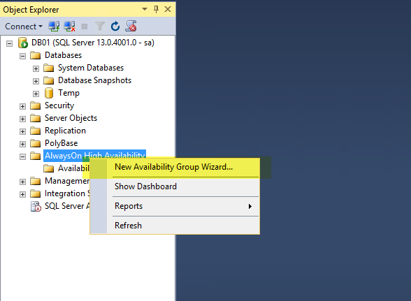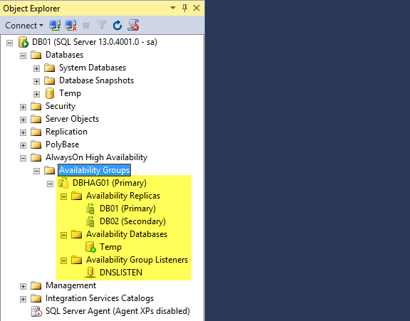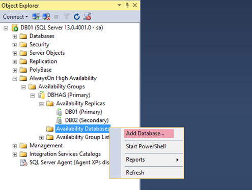 1. Open “SQL Management Studio” on any SQL Server and Connect to both DB01 and DB02. The databases are created only in Primary Replica which is “DB01” (image " i below).